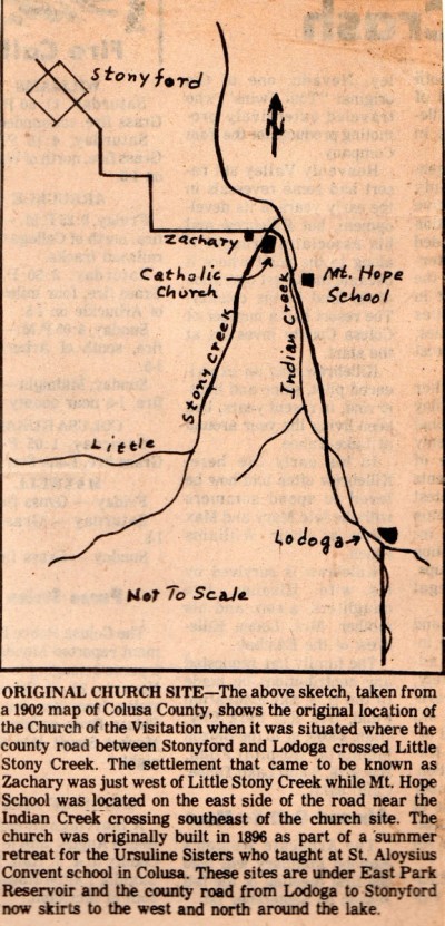 hurch was the first house of worship in these mountains. It was first named Mt. St. Mary’s, then changed to Mt. St. Zachary’s, for the great Eighth Century Catholic Pope. Then in 1899, upon its dedication by Bishop Thomas Grace, of the Sacramento Diocese, its name was changed to Our Lady of the Visitation. The church was sited near Little Stony Creek, a community that had existed since the early 1860s. A school, known as Mt. Hope, had been located here since about 1877. The name Mt. Hope preceded Zachary as a name for this community. The name Zachary probably came from the name of the church and was later formalized by the establishment of a post office, in May 1900.